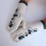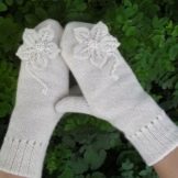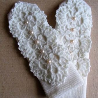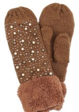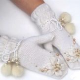 Av intresse är också dekorationen med blommor - nyligen har det funnits en tendens att dekorera vantar med en sådan voluminös prydnad, gjord i stor stickning eller från en separat typ av dekor - pärlor eller pärlor.