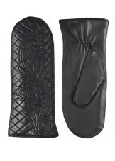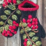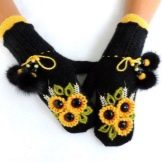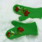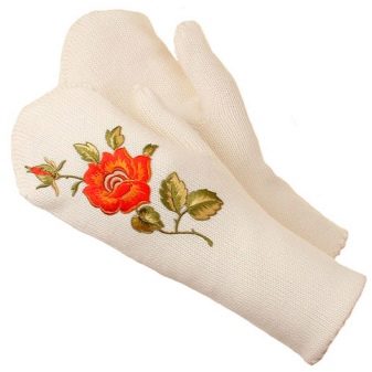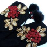 Blommor prydnad - rönn, blommor, bär, kommer att bidra till att lägga till lite rysk smak till bilden. Modeller av svarta vantar, gjorda av tätt tyg eller läder med kantband med röd päls runt kanterna, ser väldigt intressanta ut. Om du också applicerar en voluminös dekor i form av stora röda blommor med gröna löv på en sådan duk, kan sådana vantar säkert bäras för festligheter tillägnad avskedet till vintern - det är i sådana vantar du kommer att vara huvudpersonen vid festligheterna. Genom att komplettera ensemblen med en färgglad halsduk draperad över dina axlar, kommer hela din bild att vara förkroppsligandet av den ryska andan och festliga stämningen.