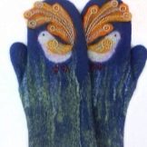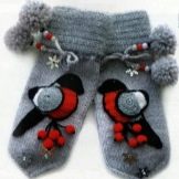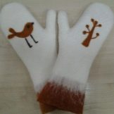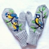 En mängd olika material och tekniker används för att dekorera vantar - broderi, vävning, målning på tyg, dekoration med stenar, pärlor, pärlor, strass. Animalistiska mönster ser väldigt organiska ut, till exempel bilden av vinterarter av fåglar. Naturligtvis kommer de inte att likna originalet, eftersom det är ganska problematiskt att reproducera ett sådant levande mönster på tyg med trådar, men ändå kommer den allmänna stämningen i bilden att ställas in.