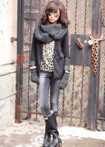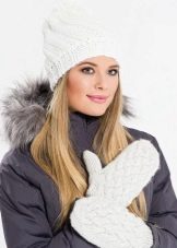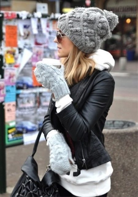 Vantar stickade med tjocka garnflätor ser ekologiska ut med en svart skinnjacka. En mössa för att matcha vantarna kompletterar framgångsrikt denna enkla, men samtidigt ganska intressanta bild.