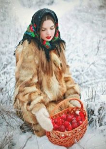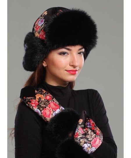 En mycket feminin och urrysk kombination - en dammössa med öronlappar med öron knutna vid kronan, kantad med naturlig päls och textilvantar med samma pälskant. Huvudhöjdpunkten och ljusa accenten i uppsättningen är ett tryck - en blommig prydnad i rysk stil. Nu vinner ett sådant mönster popularitet inte bara i sitt hemland - i Ryssland, utan också på världscatwalken, och används för att dekorera yttre och lätta kläder, skor och accessoarer.