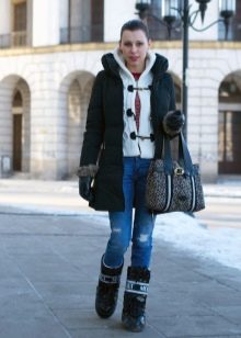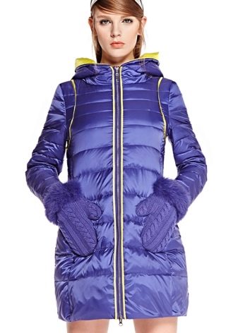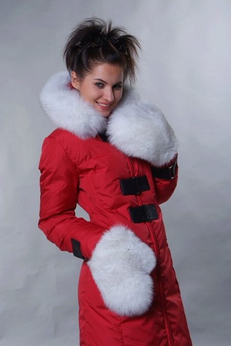 En mycket stilig och livlig look. En ljusröd dunjacka med dragkedja av regnrockstyg skyddar perfekt i dåligt väder och från snö och regn. Att dekorera huven med kaninpäls hjälper till att rädda den känsliga huden i ansiktet från frost och taggiga snöflingor. På händerna - voluminösa, men väldigt söta vantar gjorda av samma päls, i färg som helt matchar huvans trim. Denna tandem ser väldigt intressant och mysig ut.