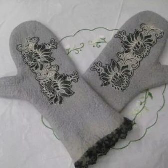 Beroende på syftet kan även vantar på konstgjord isolering ha ett annat toppskikt - filt eller mocka, de kommer att fungera som en underbar dekoration och kommer framgångsrikt att passa in i vilken snygg båge som helst, och med dekor från Pavloposad-sjalar kommer de att betona din individualitet och raffinerade smak.